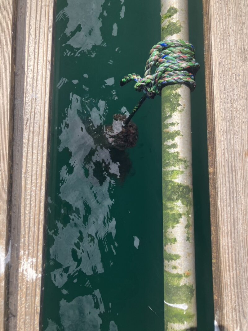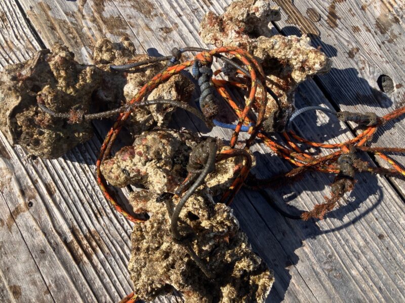 - ライブロックの再生方法として、今回は ①貝袋にデッドロックを納めて海中で畜養する。 ②牡蠣ロープの様にデッドロックを設置して海中で畜養する。
