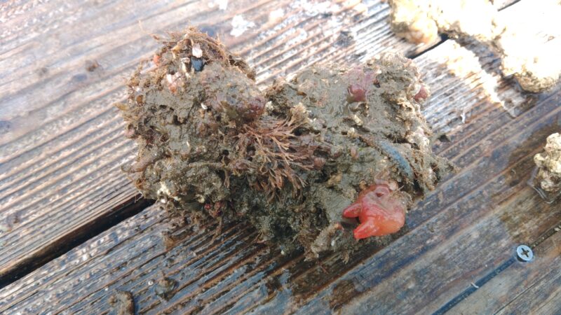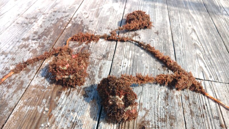 前回の投稿でも述べたように それぞれメリット、デメリットがある。 ②方式では 海藻の活着は良いがベントスクラウドの形成は弱い ①方式では 網目が現行の赤貝袋では 目詰まりが激しく デッドロックまで海藻が入り込めないが形成する生物叢(ベントスクラウド)は豊富で生物種も多い